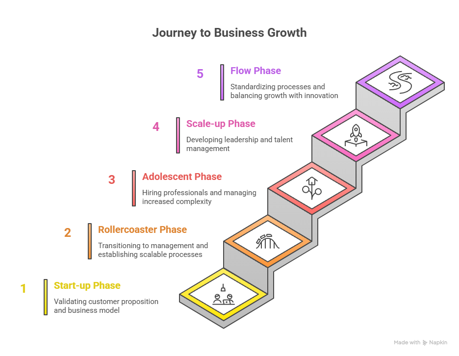 Before we dive into the methodology itself, it's crucial to understand where your business currently sits in the growth journey. Verne Harnish identifies five distinct stages of business growth, each with its own unique challenges and requirements. Understanding your current stage will help you prioritize which aspects of the Scaling Up methodology to focus on first.